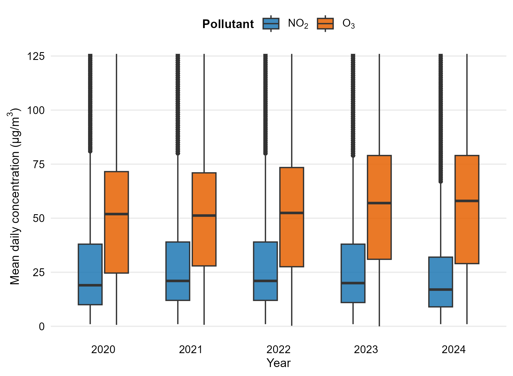 Overall, the boxplots highlight distinct distributional patterns between the primary pollutant (NO₂) and the secondary pollutant (O₃), providing a descriptive baseline for the subsequent correlation and modelling analyses.