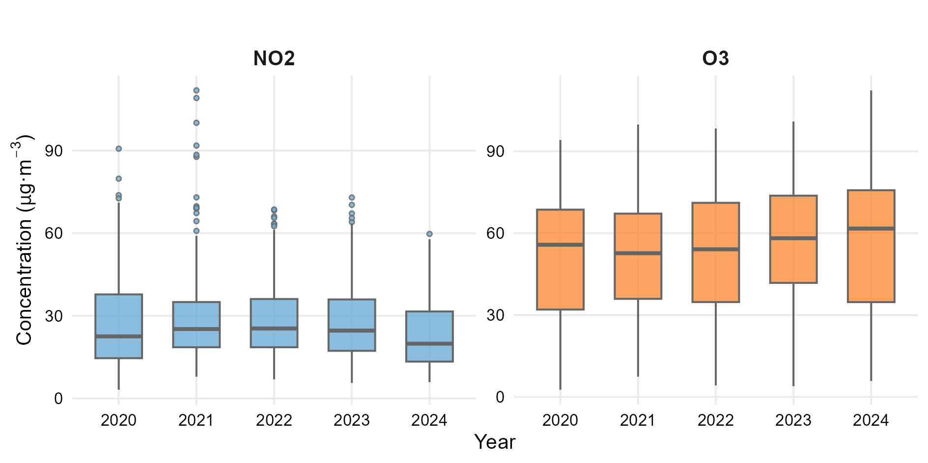 Figure 4 shows the annual variability of daily mean NO₂ and O₃ concentrations over the 2020–2024 period. NO₂ concentrations display relatively stable distributions with a slight reduction in median values in the most recent years. In contrast, O₃ exhibits higher dispersion and a progressive increase in median and upper-range concentrations, reflecting its pronounced seasonal behaviour.