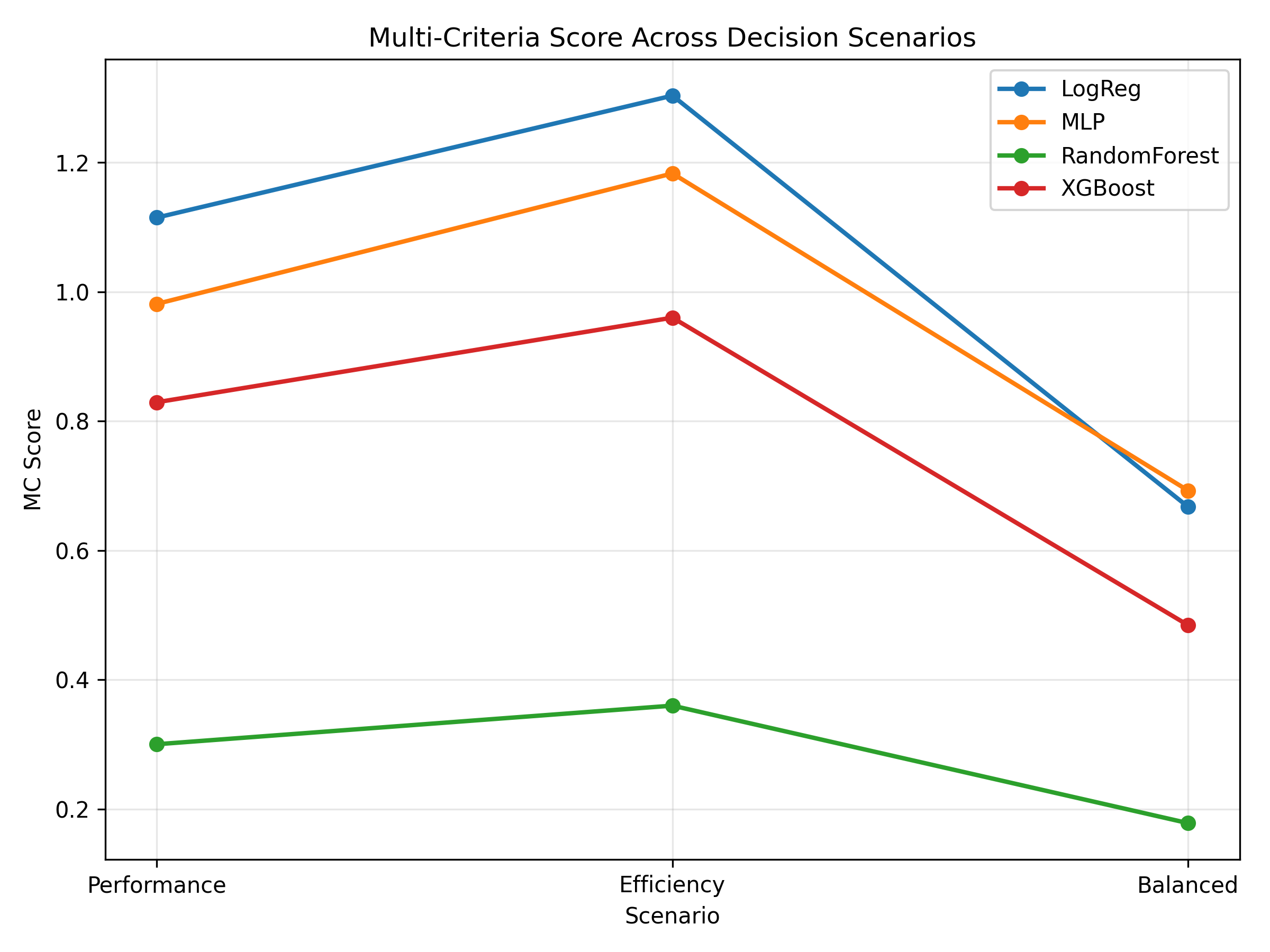 Model comparison depends on the evaluation priorities adopted. Three decision scenarios are considered: - Performance-driven - Efficiency-driven - Balanced