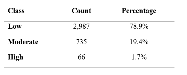 Daily PM2.5 concentrations are categorised into Low, Moderate, and High classes according to WHO-based thresholds. The resulting distribution is structurally asymmetric.