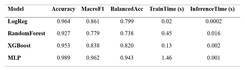 - Structural class imbalance distorts naive accuracy-based evaluation.